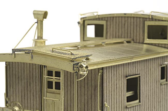 A 3/4 detail view shows the removable marker lantern in place, these can be moved from end to end to accommodate operations in both directions. The lanterns on the finished models will be illuminated as on our previous PRR cabin cars.