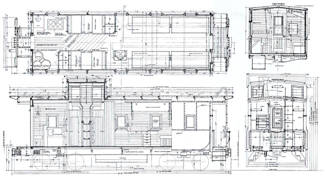 Shown above is caboose #205, a C-30-3 class wooden caboose which was built in 1930, this photo was taken in 1946. The plan and elevation view drawings for this class are shown immediately below. The construction of the C-30-3 class began in 1929 and continued for two years, resulting in the construction of more than 79 cabooses assigned to various sections of the road. Almost identical to the earlier sub-categories in the class, the dash 3's were unique in that they utilized a steel frame rather than the earlier wooden type. Despite their early construction, many remained in service into the 60's. There were numerous upgrades and paint scheme changes during their service life that can be modeled. |