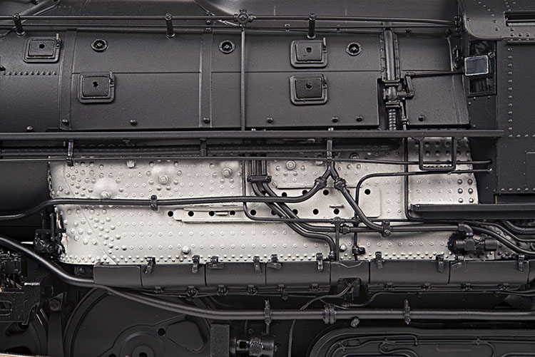 The firebox of the early configuration coal fired locomotives are loaded with detail, from the very finely reproduced hollow-core staybolts and the washout plug detailing to the secondary air inlet slide plates. If you look closely, you can see that the lagging over the firebox is actually layered over the actual firebox sheeting and you can see the staybolts visible underneath. The amount of piping speaks for itself and is accurately reproduced based on construction order and road number of the model. You can also see the top of the steam turbine located in it's original location on this version #1 model. |