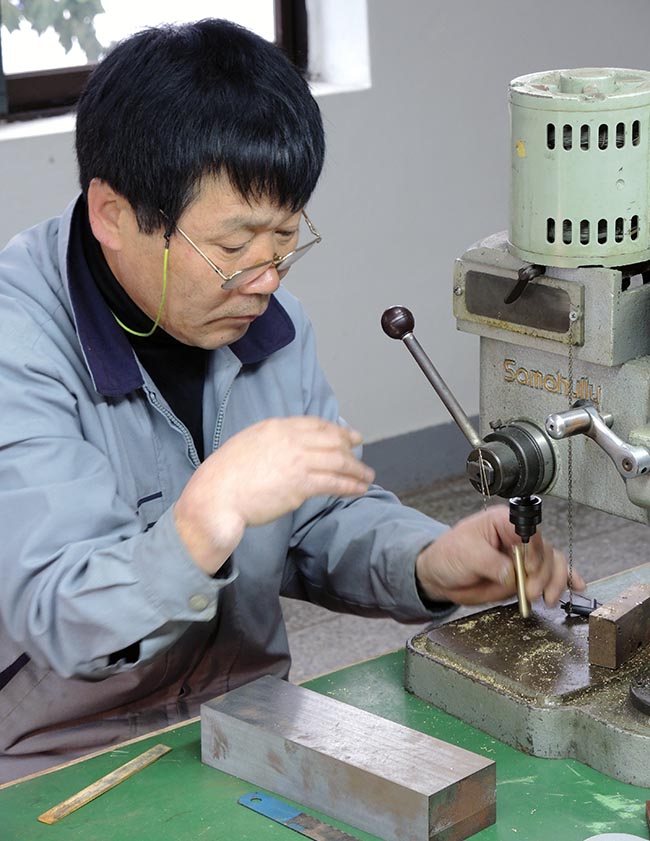 In the photo below, Mr. Kong is processing the air reservoir tanks that are to be mounted under the running boards. Close attention has to paid since there are two types of cylinders used based on specific model versions.