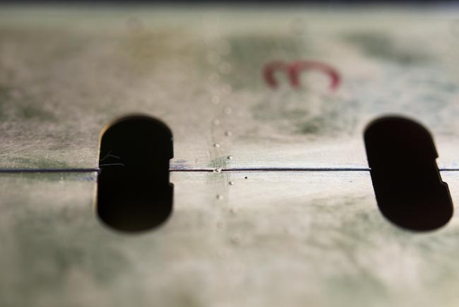 The view below shows the fine and uniform finish provided by the machining process. You can also see the precise hole placement to the right of the cutouts in the frames.