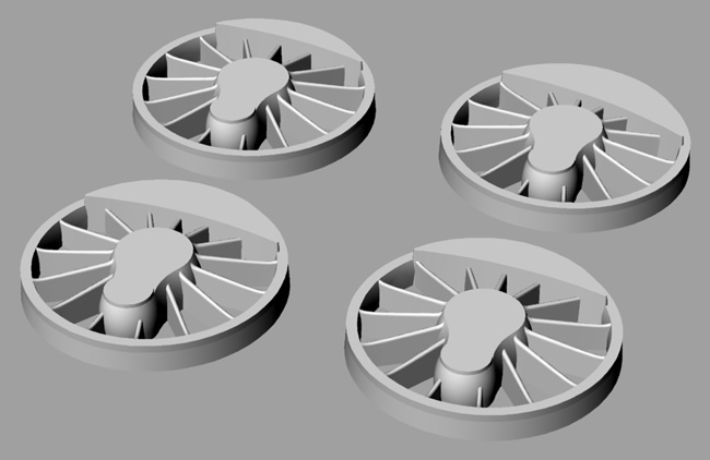 6/15/03 - The postal mail update for our UP 'type' customers has gone out, if you are a reservation holder and have not received the update, please let us know. As soon as the last sample models arrive they will be photographed and there is a new 4-page color update that will go out to reservation holders. Based on the part samples and drawings that we have been reviewing, this will be our best yet for a variety of reasons. Our future 'Big Boy' without our 4-12-2 as a stablemate will just not be the same because the prototype development and operations were so intertwined during the period we are modeling. Our final push towards completion of this project will begin very shortly. 6/04/03 - For all of our UP customers, there is a new update in the mail to you and you should be receiving it shortly. We are currently awaiting the arrival of our preproduction samples that will show all of the redesign work that has be done updating the versions. The drawings and parts that we have reviewed are very exciting to us, this promises to be the best project to date with some truly unique detail and attention to historical accuracy. Our efforts on this project will provide the first true representation of this prototype in miniature and will be a great stablemate for our Union Pacific 'Big Boy' when we get to that point. 4/19/03 - As of this date, many components for our Union Pacific project are in final production and the final pre-production prototype models are being finished up. As soon as the models are in our hands a comprehensive set of photos will be posted to the UP 'type' site. Extensive redesign work was required based on our change of direction, but we are very happy with the end result of that effort. For those with reservations, we will be sending out the notice for the second installment in the next couple of weeks. Shown below is an example of some of the new technology we are utilizing in designing and manufacturing our models; this is a rendering of the solid computer models used to machine the driver centers, notice the four different styles required. The rendering does not show the exact final shape that you will see when you look at the drivers on the actual model, the final shape is dependent on the shape of the cutter used that will leave the correct radii where the spokes meet the rim and center hub. You can get a pretty good idea of how complex the shape of each center is and how difficult it is to get the shapes exactly correct.