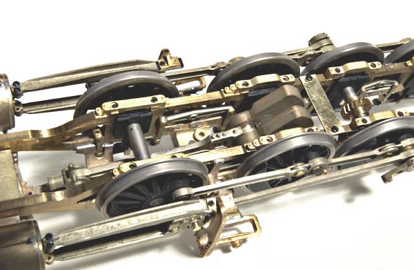 6/4/02 - The image below is one of about a dozen that we will be posting showing the continuing progress on our sample model for this project. We hope to have the images 'up' in the next 24 hours. This 'shot' shows the 3rd cylinder crank and rod as well as many of the equalized suspension components. We continue to try to find new ways of doing it better!