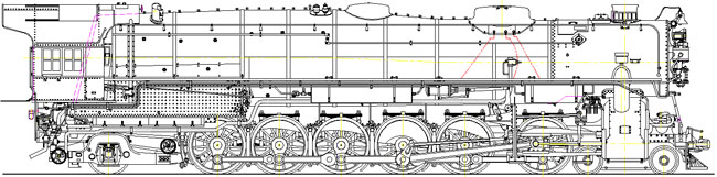 Pre-war Configuration: this will include UP-3 and UP-4 locomotives with road numbers ranging from 9015 to 9054. Unlike the UP-1 and Up-2 locomotives, those in this group are all equipped with front-end throttles, they also utilized fabricated frames and steam cylinders. This configuration features a boiler-tube pilot, matched drivers, three (3) exposed sander lines and ‘early’ style rods with Alemite grease fittings. The cab has an extended back wall to allow for a new brakeman’s seat behind the fireman, a ‘greenhouse’ type extended engineer’s sliding side window and it retains the original sliding ventilators on the roof. Because this configuration existed during the railroad’s transition period, both ‘early’ and ‘modern’ style graphics are appropriate. A near as-built style 18C 18,000 gallon tender is included with this configuration. |